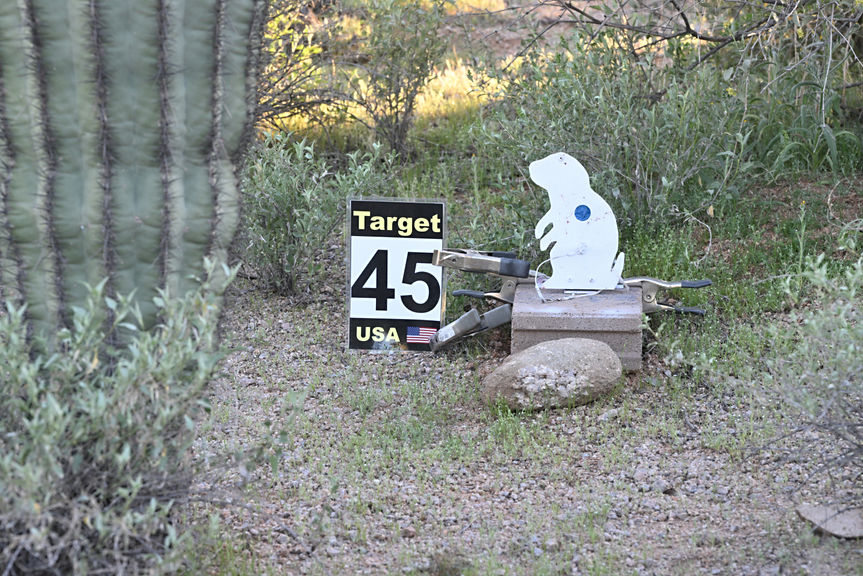 The course was set up as a 25-lane, one-shot-per-target course. It would be a training run for the Worlds here in the fall. The signage was all World-standard lane and target markings, and the international standard for scorecards was also used. The shot order was numbered, rather than the typical left to right or near to far. Most ended up being left to right, although one was quite tricky to discern. The intention was to use the same targets to be used for the WFTC, but they had yet to arrive. So, we used our original targets and got pretty close to the WFTF specs, but not quite. AAFTA KZ sizes were, of course, in compliance. About seven of the intended 40mm kz targets were either 1.25” or 1.75”; with the latter KZ sizes near the 54-yarders. The course comprised over 46% of the targets set at distances greater than 40 yards. This provided incredible challenges for competitors unfamiliar with wind conditions at the farthest lengths, especially in the desert, where natural wind indicators are diminished. The Troyer for this course was set at 33.8 without environmental conditions. However, with wind, it had kicked up the factor to 41.46T. This will be the number submitted to AAFTA for Grand Prix ranking purposes. There were two standing lanes and two kneelers, totaling eight shots per day, and 16 positionals total. We set up the chrony station mid-field alongside the air station, beverage, and snack table. Larry manned it, weighing the pellets and providing match stickers and approval stamps on the scorecards to those making it through if they passed. We even assigned this as a starting lane to squeeze an additional group in.